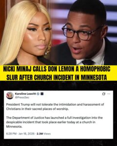 Nicki Minaj reacted almost immediately on X, posting a series of furious messages that escalated quickly. In one widely shared post, she wrote: “Don Lemon needs to be arrested. Disrespecting God’s house like that and y’all defending it? F**got behavior.” The use of the homophobic slur — directed at Lemon, who is openly gay — triggered instant backlash. Within minutes, #NickiHomophobic and #CancelNicki were trending, with thousands condemning the language as unacceptable, especially from a public figure who has positioned herself as an advocate for marginalized communities.