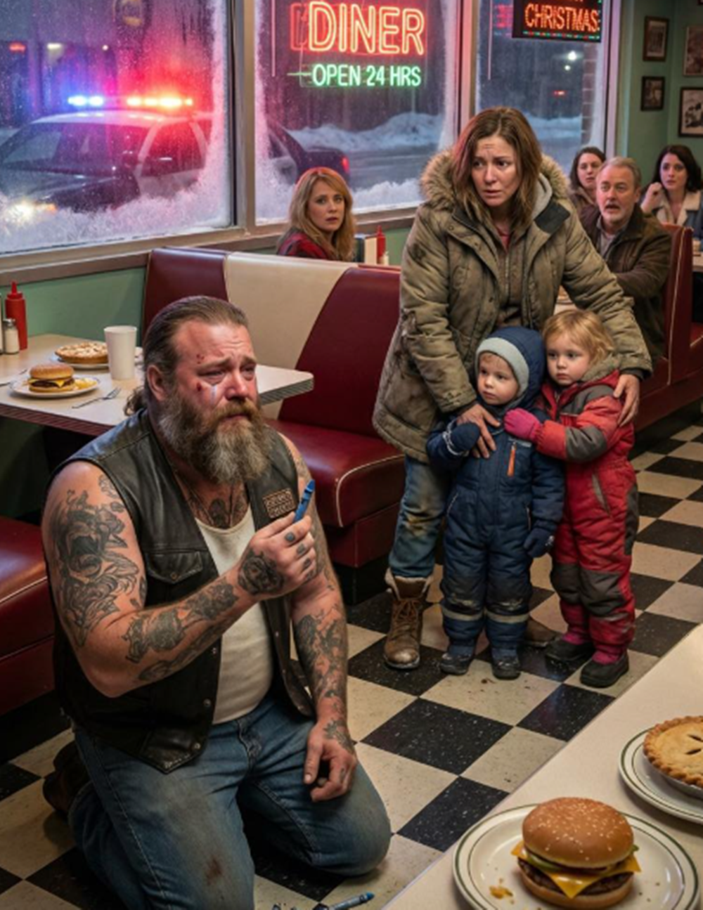 The biker stomped snow from his boots, each step echoing too loudly, and as he turned, Claire saw the tattoos crawling up his neck—wings, skulls, names that had been crossed out and rewritten. His eyes swept the diner slowly, deliberately, as if counting exits.