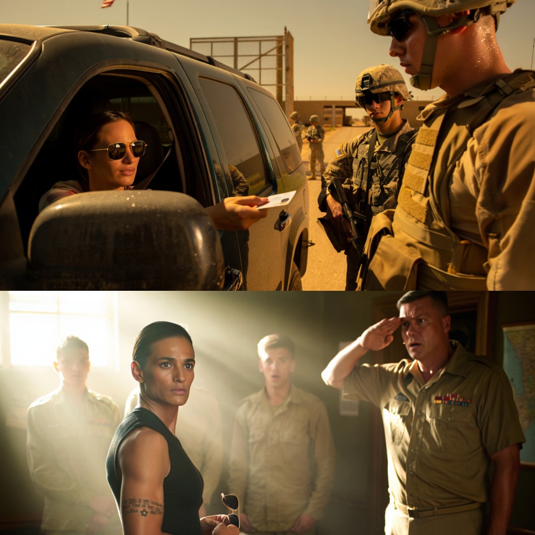 Behind the wheel sat a woman in her thirties. Her dark hair was tied neatly back. Her posture was relaxed but controlled, as if nothing in the world could surprise her. She wore aviator sunglasses, a plain shirt, no insignia, no visible rank—nothing that explained why she was here.