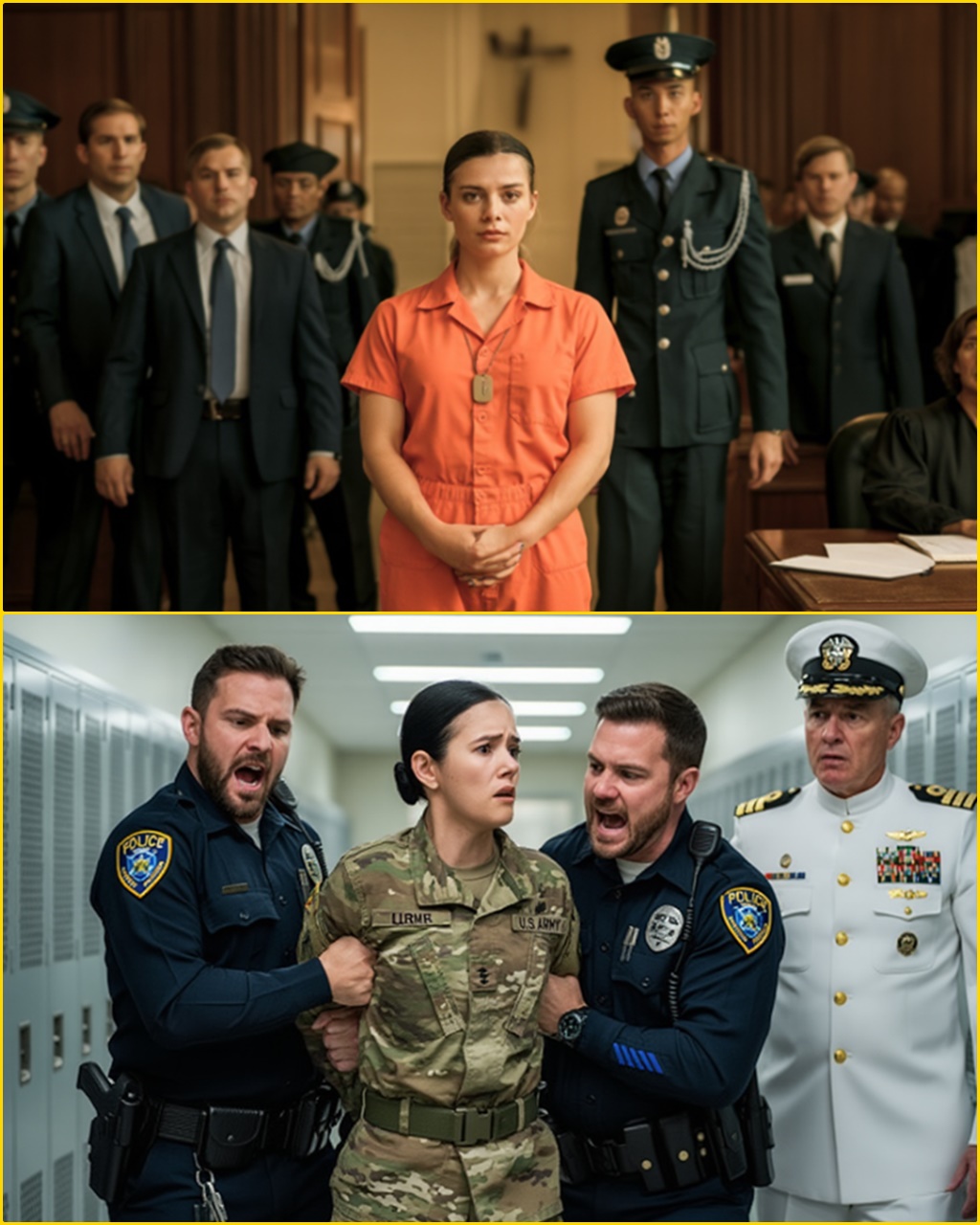 They shoved her into position before a long metal table. A temporary tribunal—three officers, all stone-faced, already bored. A recorder light blinked red.